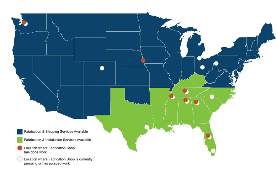 From its Huntsville location, the fab shop offers efficient means for distributing materials from coast-to-coast, while also providing distribution and installation services throughout the Southeast.